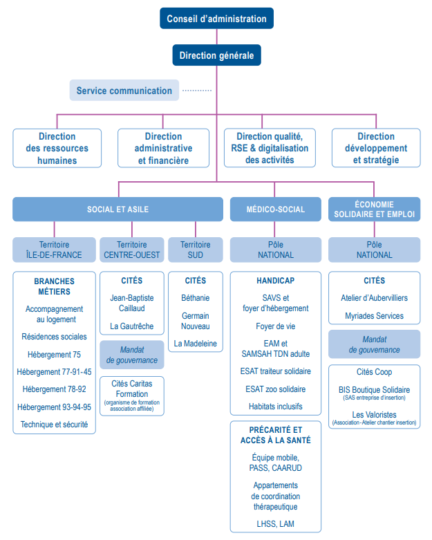 Cités Caritas gère près de 170 dispositifs répartis dans 6 régions : Centre-Val de Loire, Ile-de-France, Nouvelle Aquitaine, Occitanie, Pays de la Loire, Provence-Alpes-Côte d’Azur. Le pilotage territorial (territoires Centre-Ouest, Ile-de-France et Sud) des Cités/branches métiers institué en 2011 s’est vu étoffé, en 2020 et 2021, par la création des deux pôles nationaux : médico-social et économie solidaire et emploi.